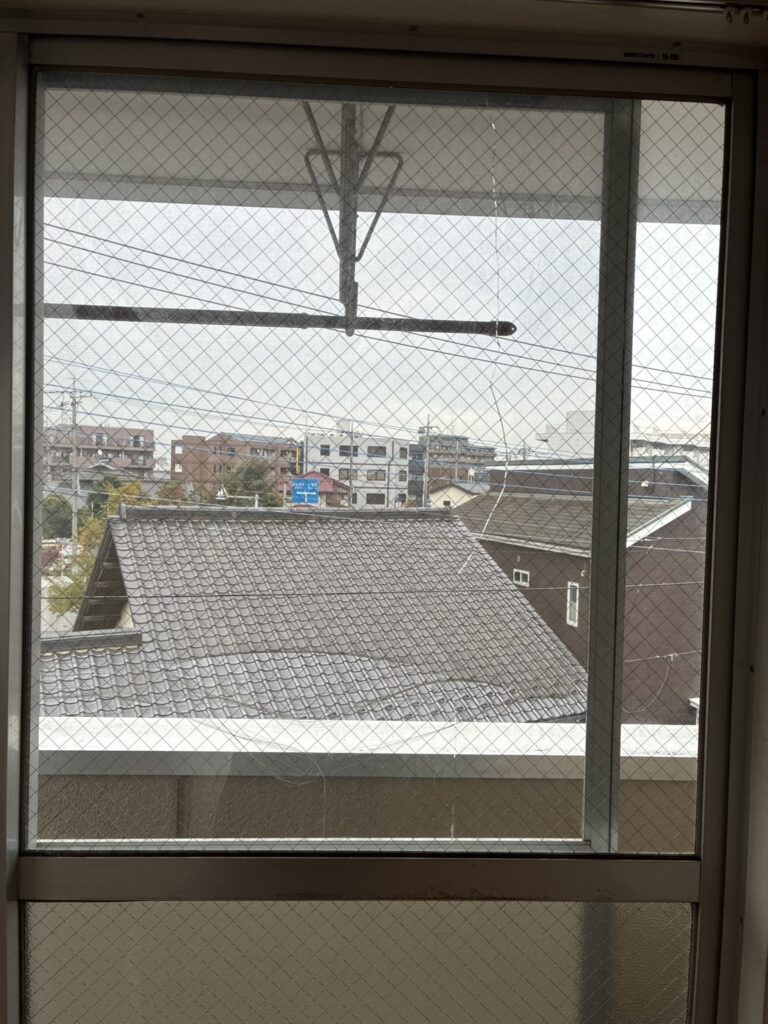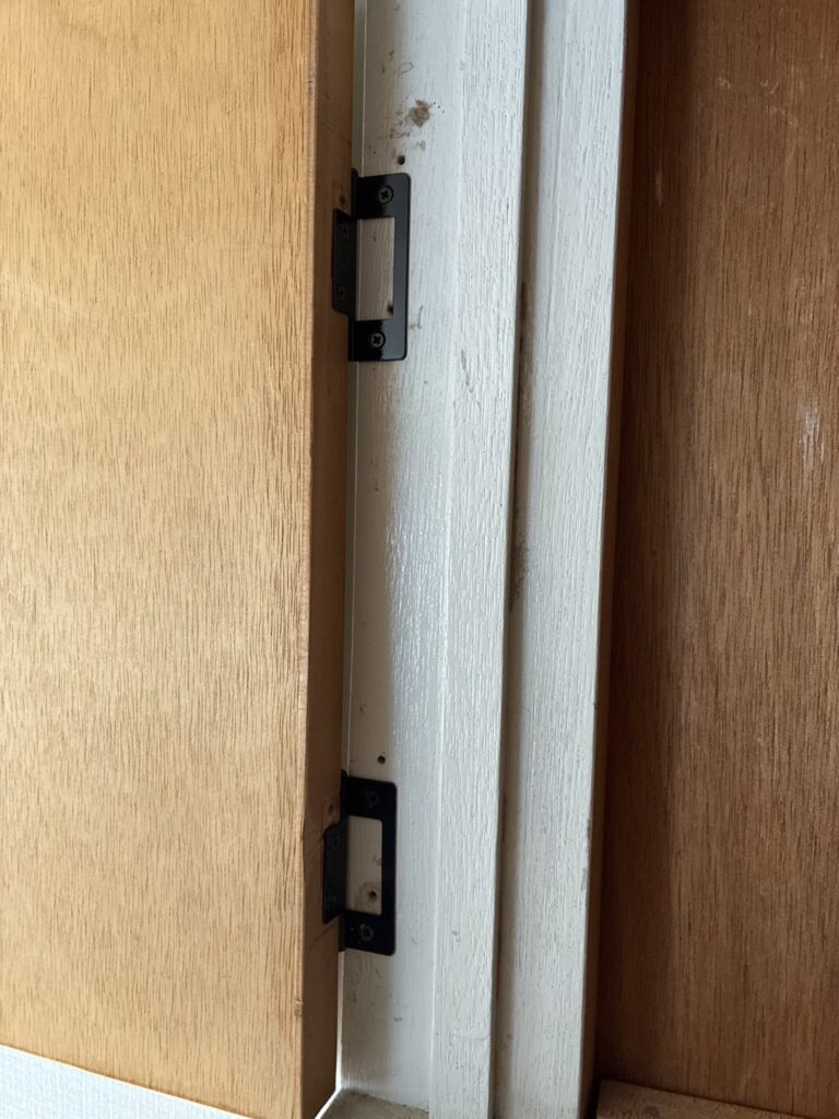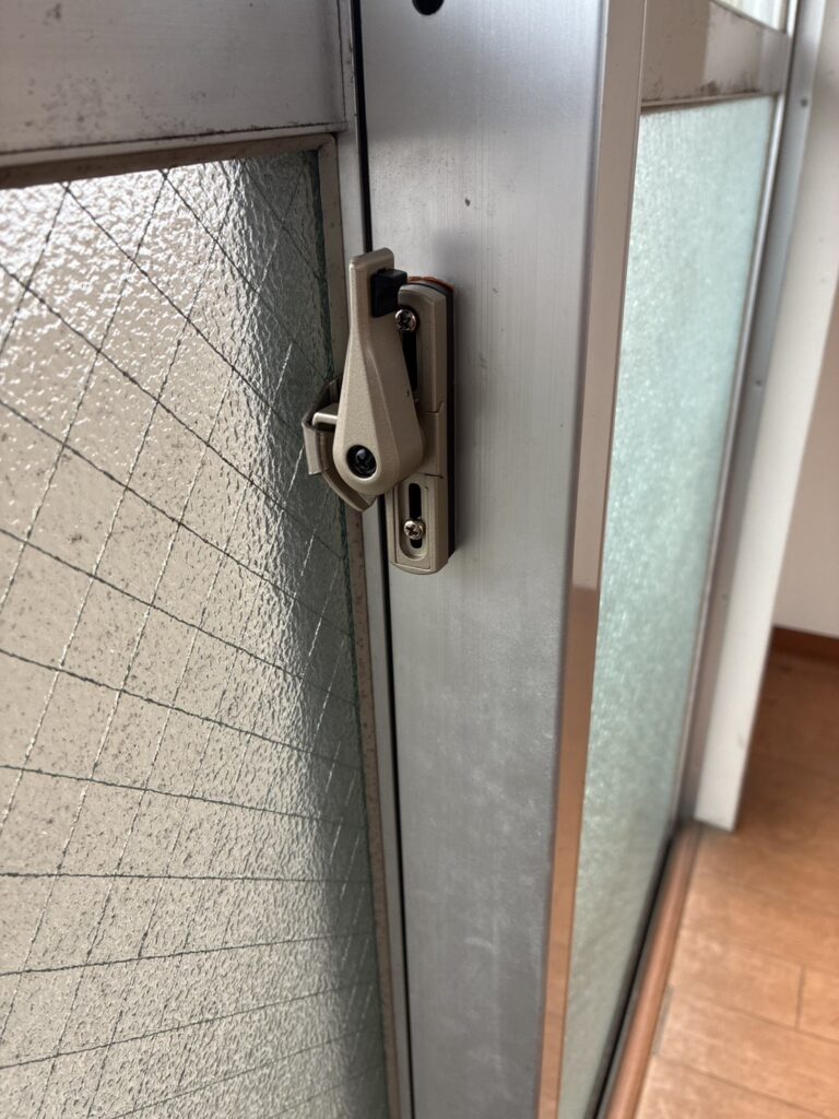 アパート一室の掃き出し窓ガラス。熱割れによるガラス交換作業。クレッセントが劣化破損している為、新しい物と交換作業。扉の蝶番が破損している為、新しい物に交換作業。