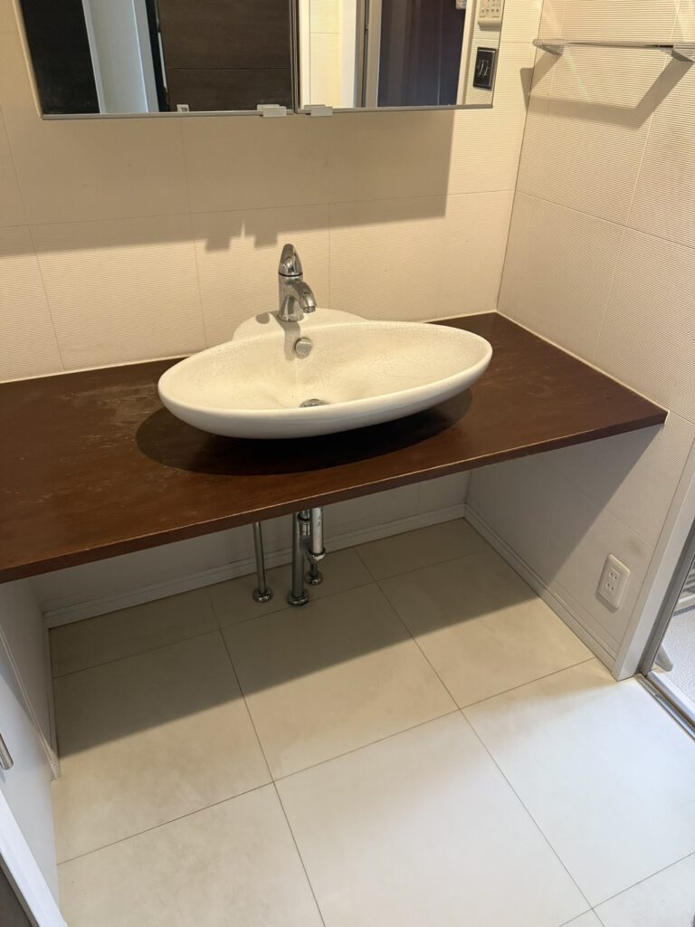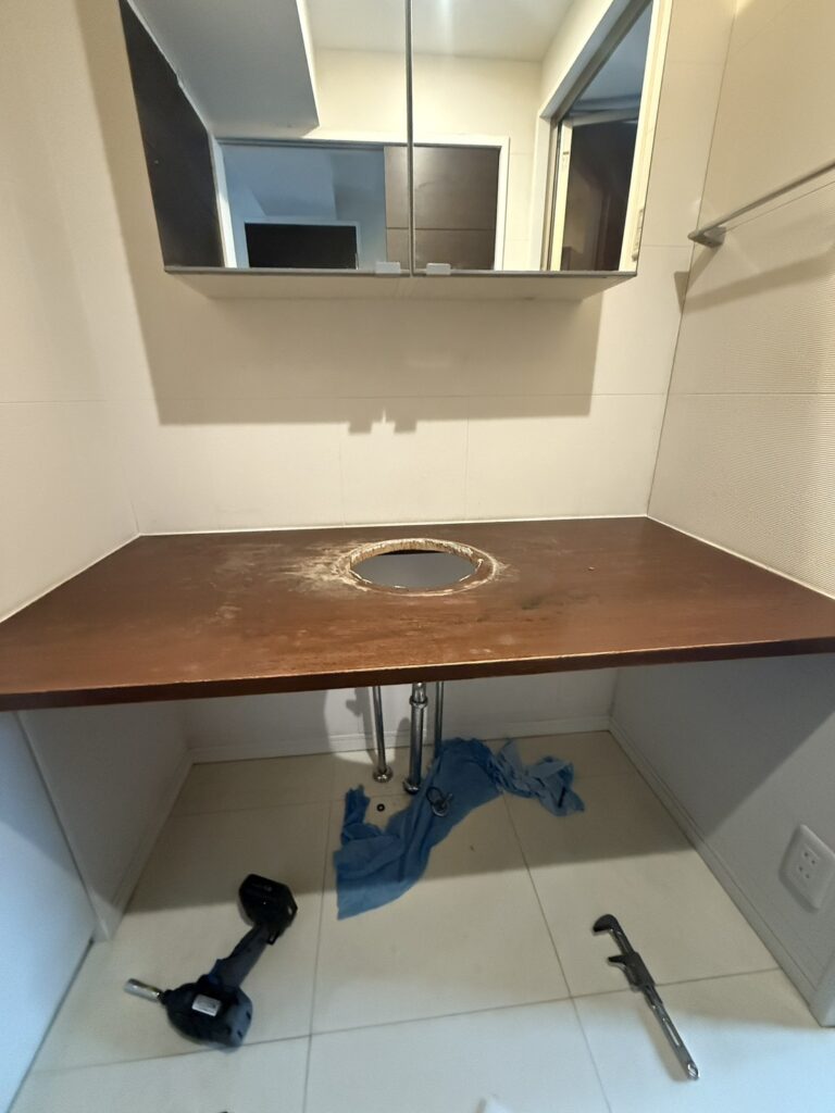 今回はマンションの洗面台ボウルが経年劣化によりヒビ割れした為交換したいとのご希望でした。まず既存の洗面ボウルを外し、洗面台をキレイに磨きダイノックシートを貼りました。その後、穴をあけ直し新しい洗面ボウルを設置して湯水今号栓を設置、給水、排水パイプを設置して最後に水漏れがないかチェックをして終了です。