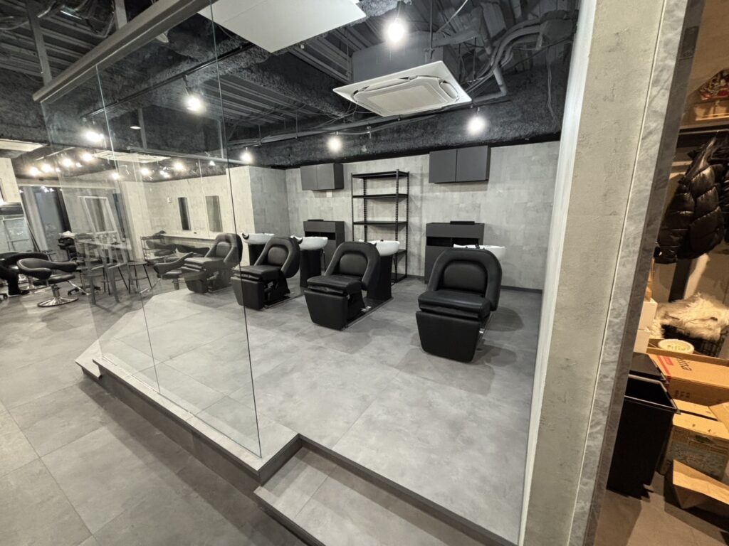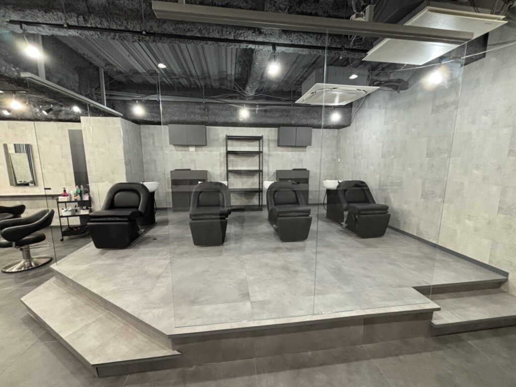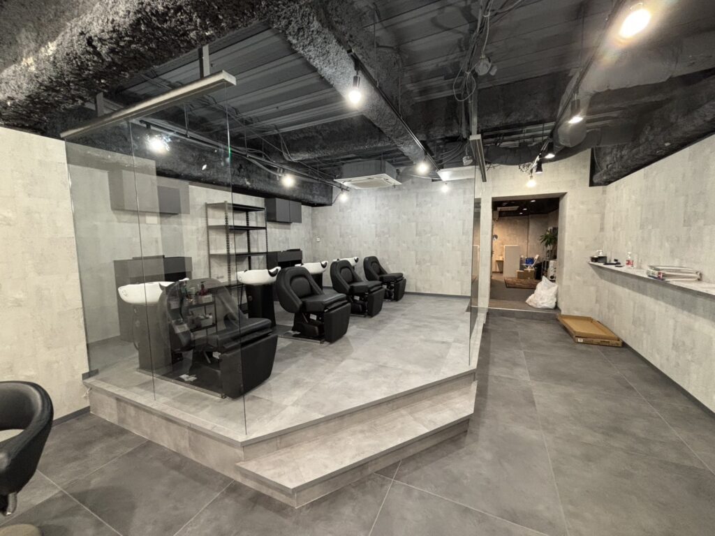 現場はビルの中にあるお店に間仕切りガラスを付ける作業になります。お客様のご要望で、出来る限り一面ガラスにとのことでしたので枠を限りなく見せないように、上下だけで固定をして2枚のガラスを並べて固定する工事を行いました。お客様にお喜びいただきました。